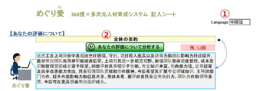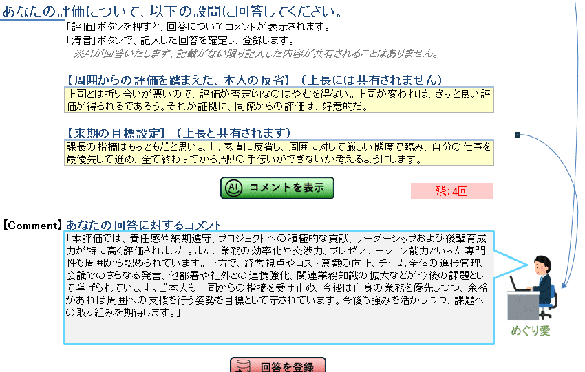 評価に対する本人の思いや内省を整理するにあたり、AIが様々な角度からアドバイスします